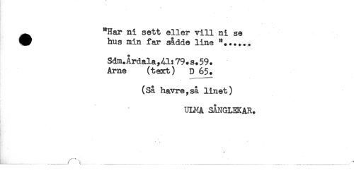 //// ^ ^Har ni sett eller vill ni se //// ^ hus min far sådde line "...... //// S S //// Sdm.Årdala,41:79* s.59. //// Arne (text) D 65. //// (Sa havre,sa linet) //// ULMA SÅNGLEKAR. //// v //// __ __.__ ' - ////