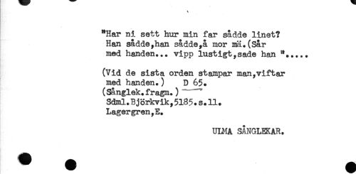 //// "Har ni sett hur min far sådde linet? //// Han sådde,han sådde,å mor ma.(Sår //// med handen... vipp lustigt,sade han "..... //// (Vid de sista orden stampar man,viftar //// med handen.) D 65. //// (Sånglek.fragm.) //// Sdml.Björkvik,5l85.s.ll. //// Lagergren,E. //// ULMA SÄNGLEKAR. ////