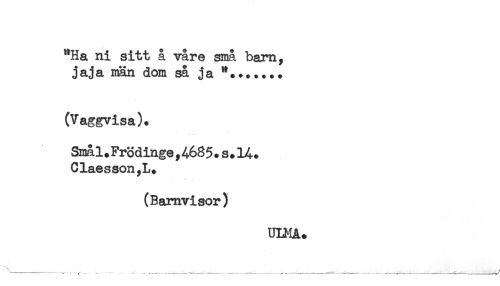 //// "Ha ni sitt å vare små barn, //// jaja män dom så ja '*. + ..... //// (Vaggvisa). //// Smål+Frödinge,4685. s.H. //// Claesson,L. //// (Barnvisor) //// UI^IA. ////