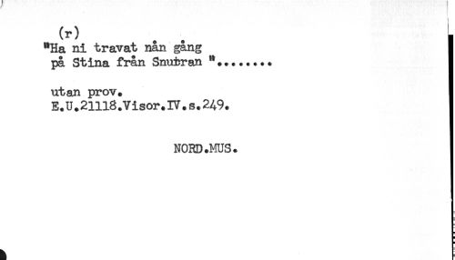 //// (r) . . L //// "Ha ni travat nån gång ] //// på Stina från Snutran ] //// utan prov. ] //// E.U.2lll8.Visor.IV.s.249. ] //// NORD.MUS. ! ////