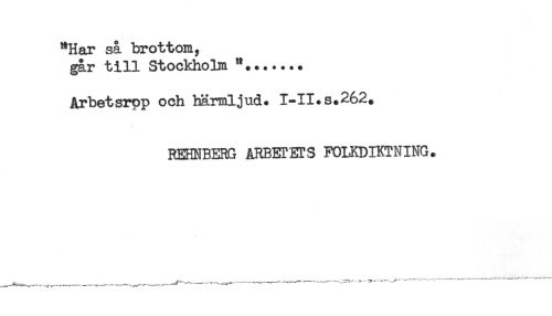 //// "Har så brottom, //// går till Stockholm //// Arbetsrpp och härmljud. I-II.S.262+ //// REHNBERG ARBETETS FOLKDIKTNING. ////
