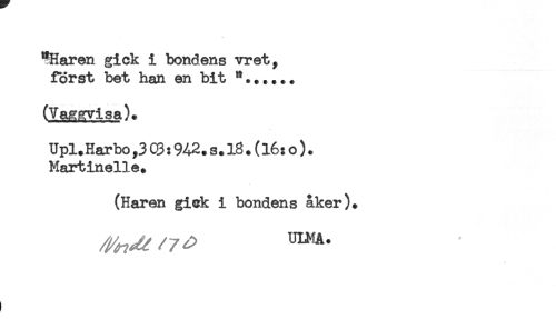 //// *Haren gick i bondens vret, //// först bet han en bit //// (Vaggvisa). //// Upl.Harbo,3 C3:942. s. 18. (16: o). //// Martinelle. //// (Haren gick i bondens åker). ////