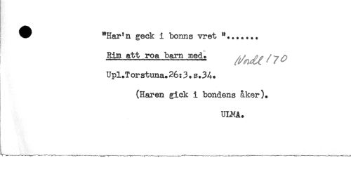 //// I ^ "Har^n geck i bonns vret //// ! //// I //// Rim att roa barn med * / ^ ^ //// Upl.T or stuna. 26:3.s.34. //// I (Haren gick i bondens åker). //// i //// ULMA. //// i //// ! ////