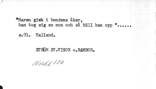 //// "Haren giuk i bondens åker, //// han tog sig en mun och så höll han opp "...... //// s.91. Halland. //// i //// STHBM SV .VISOR o. RAMSOR. ////