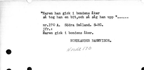 //// "Haren han gick i bondens åker //// så tog han en bit,och så såg han upp "...... //// nr.170 A. Södra Småland. S-HC. //// jfr.: //// Haren gick i bondens åker. //// NORDLANDER BARNVISOR, ////