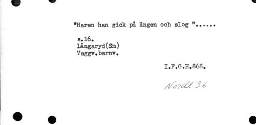 //// "Haren han gick pa ängen och slog "+..+.. //// S.16+ //// Langaryd(Sm) //// Vaggv.barnv. //// - //// I.F.G.H.868. //// . ////