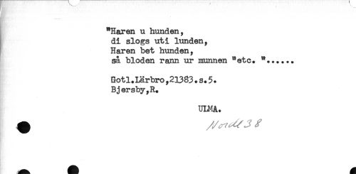 //// "Haren u hunden, //// di slogs uti lunden, //// Haren bet hunden, //// sa bloden rann ur munnen "etc. ".+.... //// Botl+Larbro,21383.s.5. //// Bjersby,R. //// ULMA. ////