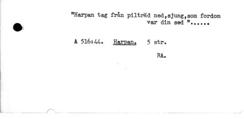 //// "Harpan tag från pilträd ned,sjung,som fordom //// ^ var din sed *...... //// A 516:44. Harpan. 5 str. //// RA. //// t ////