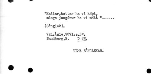 //// - //// "Hattar, hatt ar ha vi köpt, //// många jungfrur ha vi mött "...... //// (Sånglek). //// Vgl.Åsle,9871*s.30. //// Sandberg,E. D 80. //// ULMA SANGLEKAR. ////