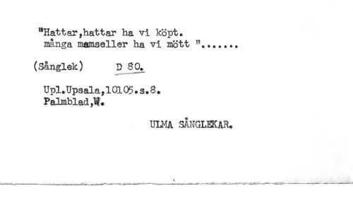 //// "Hattar,hattar ha vi köpt. //// nånga mamseller ha vi mött "....... //// (Sånglek) D 8 0. //// Upl.Upsala,ld05.s.8. //// Palmblad ,W. //// ULMA SÅNGLEKAR. ////