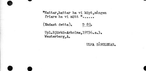 //// "Hattar,hatt ar ha vi köpt,mangen //// friare ha vi mött //// (Endast detta). D 80. //// Upl. B j örkö-Arholjna, 19736. s. 3. //// Vesterberg,A. //// ULMA SÅNGLEKAR. ////