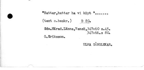 //// ^ "Hattar,hattar ha vi köpt **....... //// (text o.beskr.) D 80. //// Sdm.Härad.Lanna,Vansö,347:60 s.45. //// 347:66. s 80. //// G. Eriksson. //// ULMA SÅNGLEKAR. ////