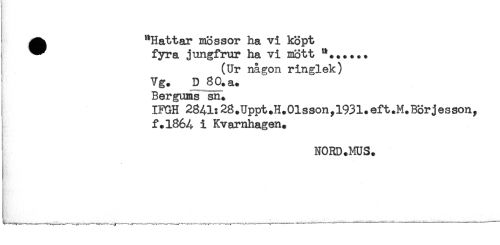 //// ^ "Hattar mössor ha vi köpt //// * fyra jungfrur ha vi mött //// (Ur någon ringlek) //// Vg. D 80. a. //// Bergums sn. //// IFGH 2841:28.Uppt.H.01sson,1931.eft.M.BÖrjesson, //// f.1864 i Kvarnhagen. //// NORD.MUS. //// i. ////