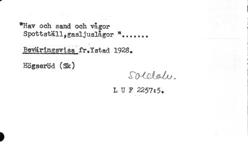 //// "Hav och sand och vågor ! //// Spottställ,gasljuslågor *....... //// Beväringsvisa fr.Ystad 1928. //// Högseröd (Sk) ' //// L U F 2257:5. //// * //// j //// i //// ! ////