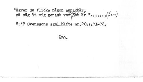 //// "Haver du flicka någon aimaf kär, //// så säg åt mig genast är //// 8:4? Svenssons saml.häfte nr.20.s.71-72. //// ÅBO. ////