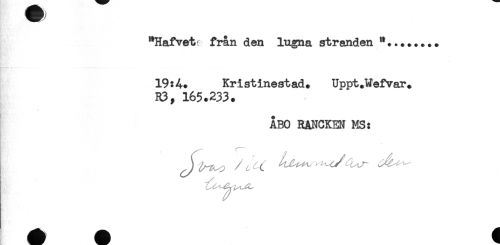 //// "Hafvet< från den lugna stranden //// 19:4. Kristinestad. Uppt.Wefvar. //// R3, 165.233. //// ÅBO RANCKEN MS: ////