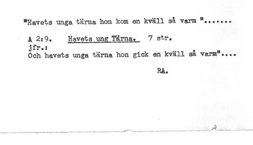 //// "Havets unga tärna hon kom en kväll så varm "....... //// A 2:9. Havets iHM? Tama. 7 str. //// jfr.: //// Och havets unga tärna hon gick en kväll sa varm".... //// RA. ////