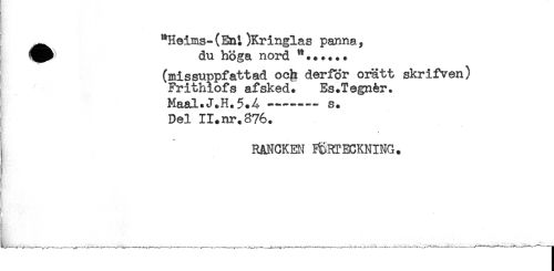 //// ^ "Heims-(Eni)Kringlas panna, //// ^^ du höga nord "...... //// (missuppfattad oc^ derfor oratt skrifven) //// Frithiofs af sked. Es .Tegnér. //// Maal.J.H.5.4 ——— s. //// Del II.nr.876. //// t //// RANGKEN ^RTECKNING. ////