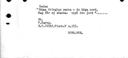 //// Heiias //// ^'Hims Kringlas panna - du höga nord, //// Tag får ej stanna- uppå din jord ".+..... //// Sk. //// V.Karup. //// E.U+22015.Visor.V s.333. //// NORD.MUS. //// ..... & . .. ....... ^ . .. .. ////