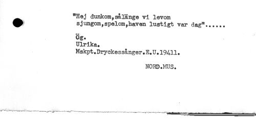 //// "Hej dunkom, sålänge vi levom //// ^^ sjungom, spelom,haven lustigt var dag"...... //// Og. //// Ulrika. //// Mskpt.Dryckes sånger.E.U.19411. //// NORD.MUS. ////