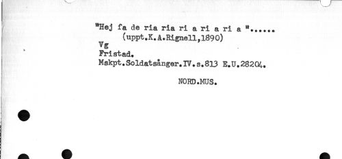 //// "Hej fa de ria ria ri a ri a ri a *...... //// (uppt.K.A.Rignell,l890) //// Vg //// Fristad. //// Mskpt.Soldatsånger.IV.s.813 E.U.282Q4. //// NORD.MUS. ////
