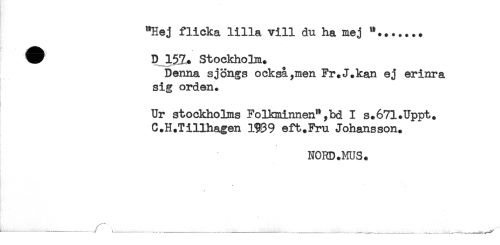 //// "Hej flicka lilla vill du ha mej //// ^ D 157* Stockholm. //// Denna sjöngs också,men Fr.J.kan ej erinra //// sig orden. //// Ur stockholms Folkminnen",M I s.671*Uppt. //// C. H.Tillhagen 1939 eft.Fru Johansson. //// * //// NORD.HUS. //// * //// —^^^^ ////