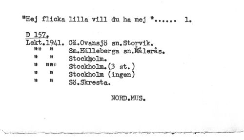//// "Hej flicka lilla vill du ha mej "...... 1. //// D 122, //// Lekt.1941. Gä.Ovansjö sn.Storvik. //// "" " Sm.Hälleberga sn.Rålerås. //// " " Stockholm. //// " """ Stockholm.(3 st.) //// " " Stockholm (ingen) //// " " Sö.Skresta. //// NOHD.MUS. ////