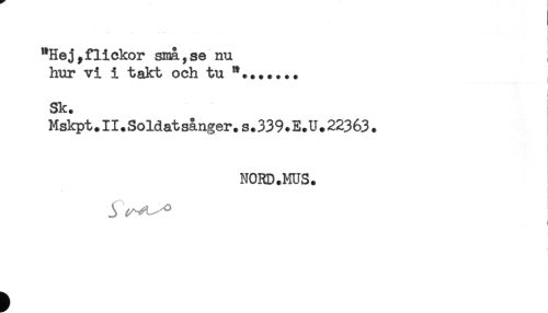 //// "Hej,flickor små,se nu , //// hur vi i takt och tu **....... //// i //// Sk. //// Mskpt.II.Soldatsånger.s.339.E.U.22363. //// NORD.MUS. //// j ////