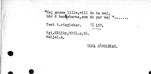 //// "Hej gosse lille,vill du ha mej, //// här ä hanäskama, som du gav mej "....... //// Text t.ringlekar. <2) 157. //// Vgl.Källby,9353.s.l6. //// Meijel.A. //// ULI^A SÅNGLEKAR. ////