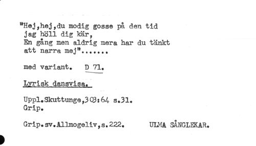 //// *Hej,hej,du modig gosse på den tid //// jag höll dig kär, //// En gång men aldrig mera har du tänkt //// att narra mej"....... //// med variant. D 71. //// Lyrisk dansvisa. //// Uppl.Skuttunge,3Q3:64 s.31. //// Grip. //// Grip.sv.Allmogeliv,s.222. ULMA SÅNGLEKAR. //// t ////
