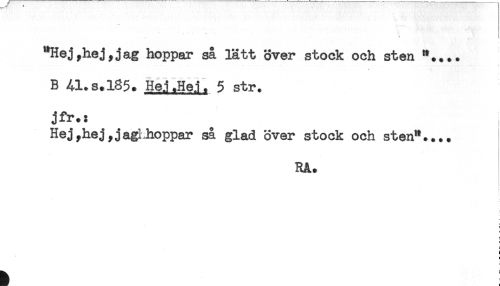 //// "Hej,hej,jag hoppar så lätt över stock och sten *.... //// B 41.3.185. He.i .He.i. 5 str. //// jfr.: //// Hej,hej, jag hoppar så glad över stock och sten".... //// RA. ////
