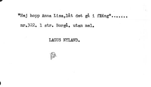 //// t //// "Hej hopp Anna Usa ylat det ga i fRäng"....... //// nr.322. 1 str. Borgå, utan mel. //// LAGUS NYLAND. ////