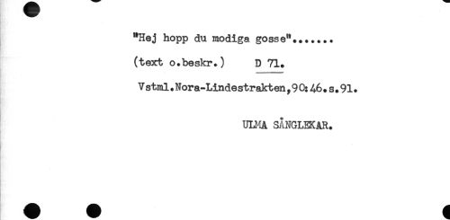 //// "Hej hopp du modiga gosse"....... //// (text o.beskr.) D 71. //// V stml. Nora-Lindestrakten, 9 0:4.6. s . 91. //// ULMA SÅNGLEKAR. ////