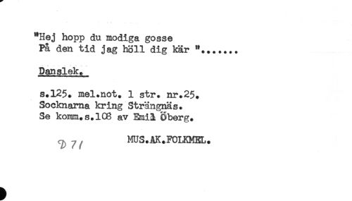 //// "Hej hopp du modiga gosse //// På den tid jag höll dig kär "....... //// Danslek. //// s.125* mel.not. 1 str. nr.25. //// Socknarna kring Strängnäs. //// Se komm.s.108 av Emiå Oberg. //// <p ^ MUS.AK.FOLKMBL. ////