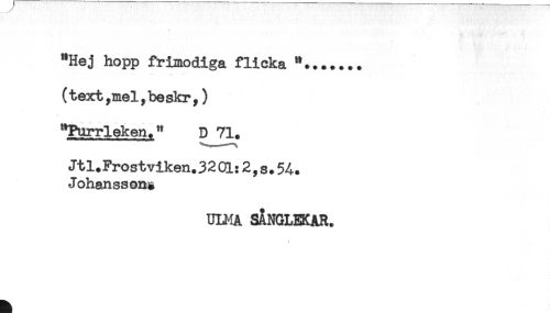 //// "Hej hopp frimodiga flicka *....... //// (text,mel,beskr,) //// "Purrleken." D 71. //// Jtl.Frostviken.32d: 2,s.5A. //// Johanssons //// ULMA SÅNGLEKAR. //// s ////