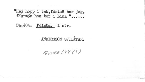 //// "Hej hopp i tak,fästmö har jag, //// fästmön hon bor i Lima *...... //// Da.484. Polska. 1 str. //// * //// r //// ANDERSSON SV.LÅTAR. //// ) ////