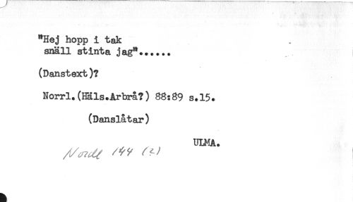 //// "Hej hopp i tak //// snäll stinta jag"...... //// (Danstext)? //// Norrl.(Häls.Arbrå?) 86:89 s.15. //// (Danslåtar) //// ULMA. //// < ////