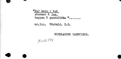 //// "Hej hopp i tak //// stormor å jag, //// tuppen å gammelhSha "....... //// nr.144. Vastmld. E.S. //// NORDLANDER BARNVISOR. //// /vy ////