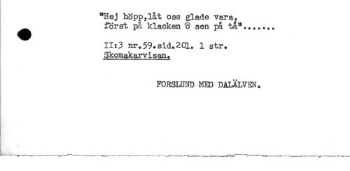 //// t //// "Hej hopp,låt oss glade vara. //// ^^ först på klacken sen på ta"....... //// 11:3 nr.59*sid.2Cl. 1 str. //// Skomak arvisan. //// FORSLUND MED DALÄLVEN. ////