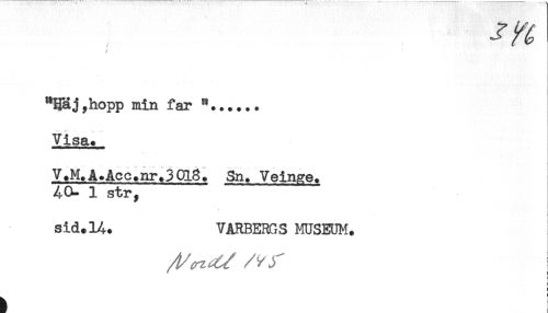 //// "Hajyhopp min far //// Visa. //// V.M.Å.Acc.nr.30l8. 3n. Veinp;e. //// 1 str, //// sid. 14. VARBERGS MUSEUM. ////