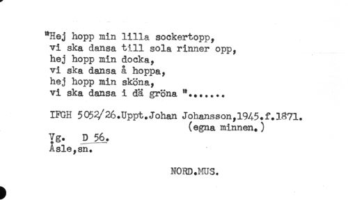 //// "Hej hopp min lilla sockertopp, //// vi ska dansa till sola rinner opp, //// hej hopp min docka, //// vi ska dansa å hoppa, //// hej hopp min sköna, //// vi ska dansa i dä gröna "....... //// IFGH 505^26.Uppt.Johan Johansson,l%5.f.l871. //// (egna minnen.) //// Ye* D 56. //// Asle,sn. //// NORD .ms. //// t ////