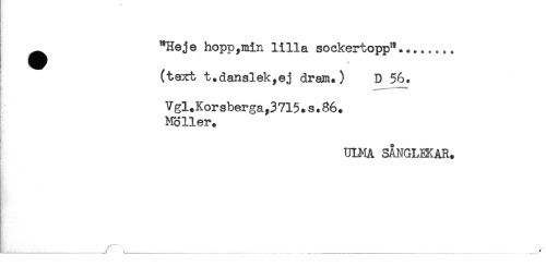 //// "Heje hopp,min lilla sockertopp"...,,,,, //// (text t.danslek,ej dram.) D 56. //// Vgl.Korsberga,3715.s.86. //// Möller. //// ULMA SANGLEKAR. //// !_:_______/ <___ ______..< ////