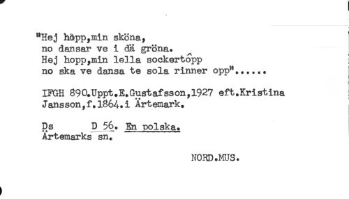 //// "Hej häpp,min sköna, //// no dansar ve i dä gröna. //// Hej hopp,min lella sockertopp //// no ska ve dansa te sola rinner opp"...... //// IFGH 890.Uppt.E.Gustafsson,1927 eft.Kristina i //// Jansson,f.l864.i Ärtemark. ; //// i //// Ds D 56. En polska. //// Artemarks sn. ////