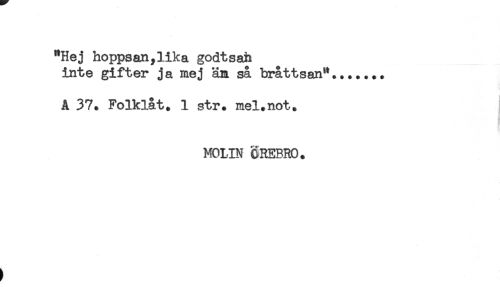 //// "Hej hoppsan,lika godtsah //// inte gifter ja mej äm så bråttsan"....... //// A 37. Folklåt. 1 str. mel.not. //// MOLIN CREBRO. ////