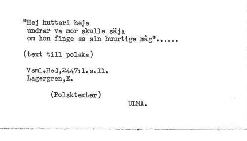 //// "Hej hutteri heja //// undrar va mor skulle säja //// om hon finge se sin huurtige måg"...... //// < //// (text till polska) //// Vsml.Hed,2447:1.s.11. //// Lagergren,E. //// (Polsktexter) //// UIMA. ////