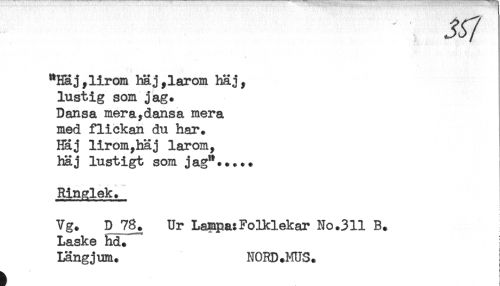 //// "Haj,lirom häj,larom haj, //// lustig som jag. //// Dansa mer a,dansa mera //// med flickan du har. //// Haj lirom,häj larom, //// haj lustigt som jag"..... //// Ringlek. //// Vg* D 78. Ur Lampa:Folklekar No.3U B. //// Laske hd. //// Längjum. NORD.MUS. ////