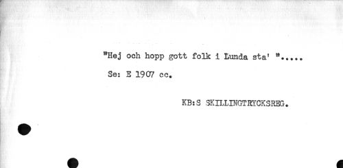 //// **Hej och hopp gott folk i Lunda stal *... + . //// Se: E 1907 cc. //// KB:S SKILLD^GTHYCKSREG. //// * ////