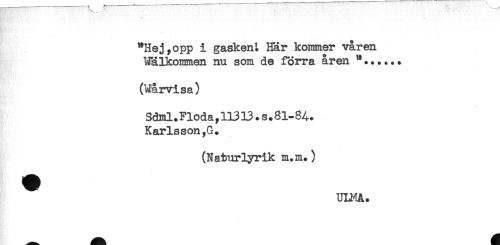 //// : //// "Hej,opp i gaskei^ Här kommer våren //// Wälkommen nu som de förra åren **...... //// * //// (Wårvisa) //// Sdml. Flöda,11313.s.81-84. //// Karlsson^G. //// (Naturlyrik m.m.) //// . //// - ////