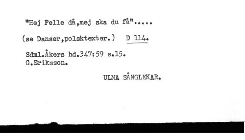 //// "Hej Pelle då,mej ska du få"..... //// (se Danser ,polsktexter.) D 1H. //// Sdml.Åkers hd.3A7:59 s.15. //// G.Eriksson. //// ULMA SÅNGLEKAR. ////
