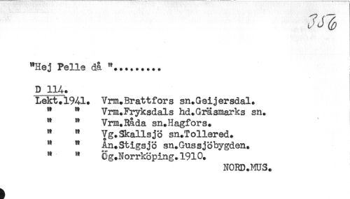 //// , i //// "Hej Pelle då "......... //// D 114. //// Lekt.1941. Vrm.Brattfors sn.Geijersdal. //// " " Vrm.Fryksdals hd.Gräsmarks sn. //// " " Vna.Råda sn.Hagfors. //// " " Vg.Skallsjö sn.Tollered. //// " " Ån.Stigsjö sn.Gussjöbygden. //// * " Cg.Norrköping.1910. //// N0RD.MU3. ////